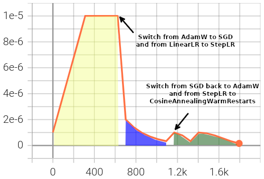 As you can observe in the explicit mode optimizer reinitialization example below, optimizers specified in different fine-tuning phases can be of differing types.