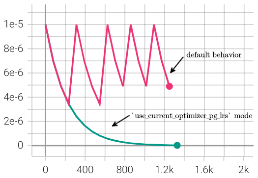 The behavioral impact of use_current_optimizer_pg_lrs (line 28 above) on the lr scheduler reinitializations can be clearly observed.¶